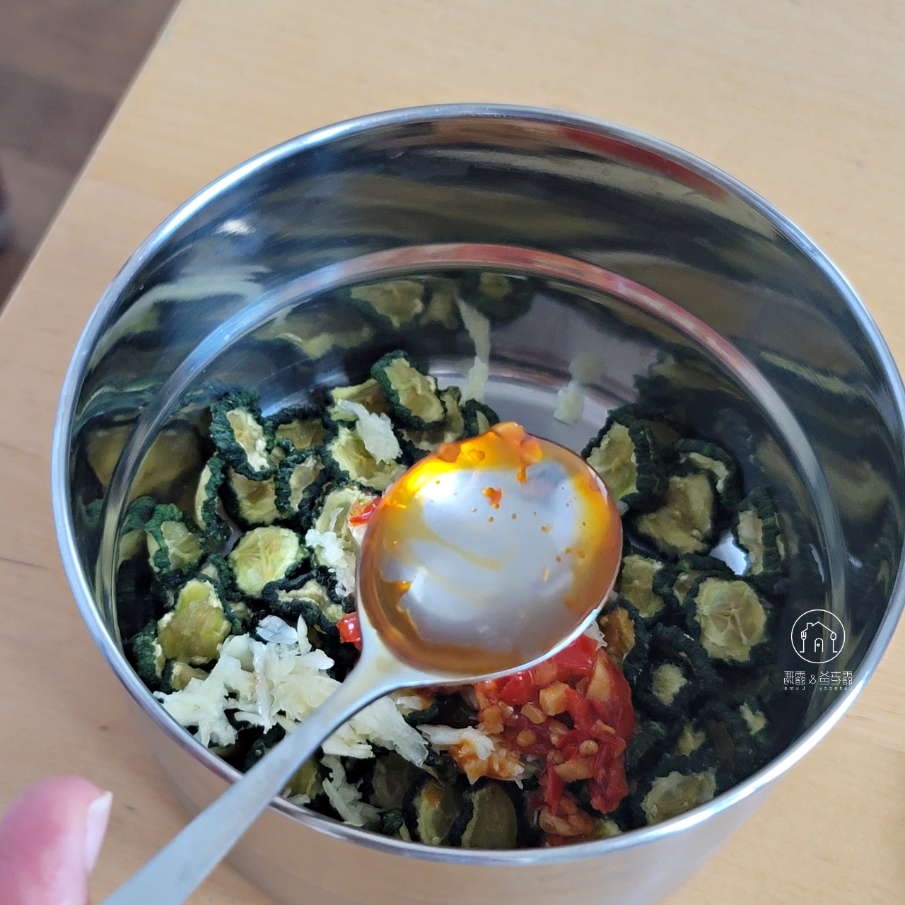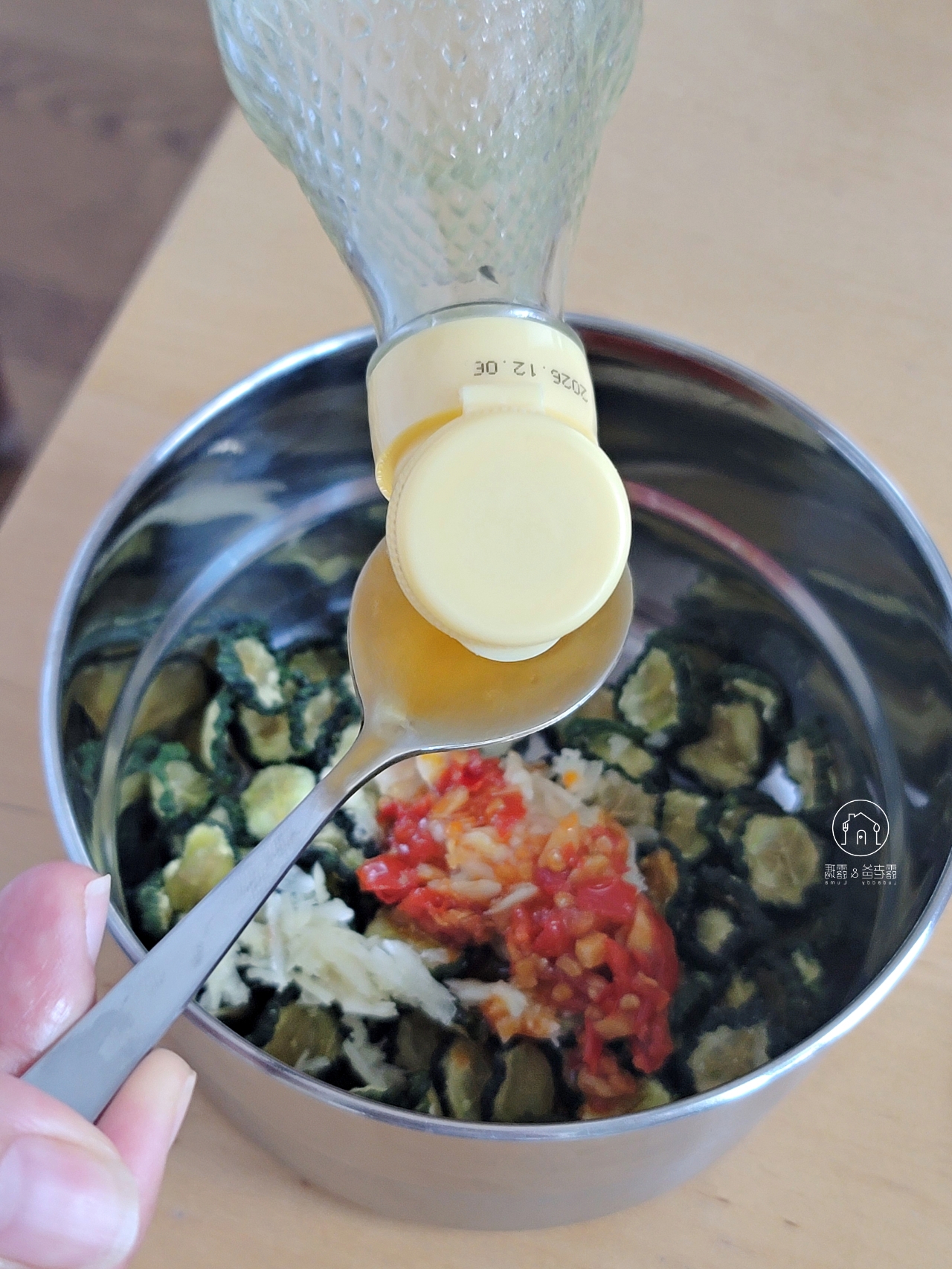 德國家裡的調味料和亞洲的有些不同,但我們還是調出了順口、帶點辣的滋味,拌入乾燥後的蔬菜中,超級入味。
