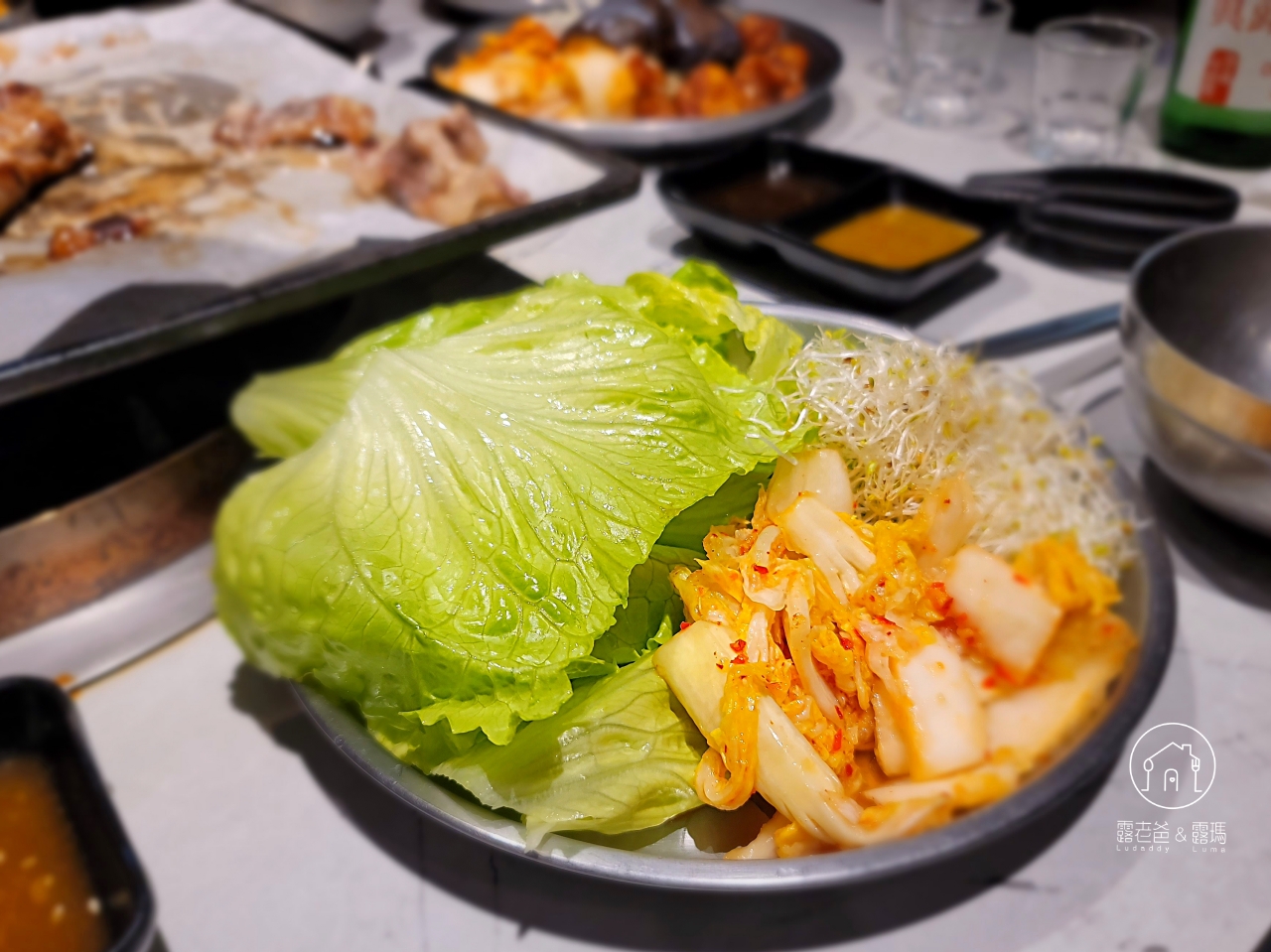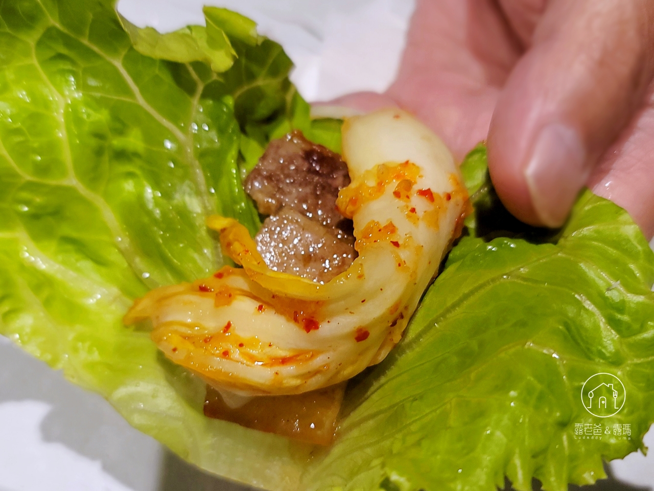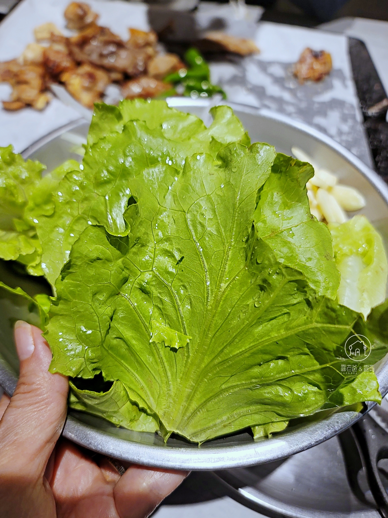 最推薦的吃法當然就是「生菜包肉」啦~看韓劇看了這麼多年,終於自己也能實現那一口包進蔥絲、小菜、蒜片、泡菜再加烤肉的吃法,超爽快!