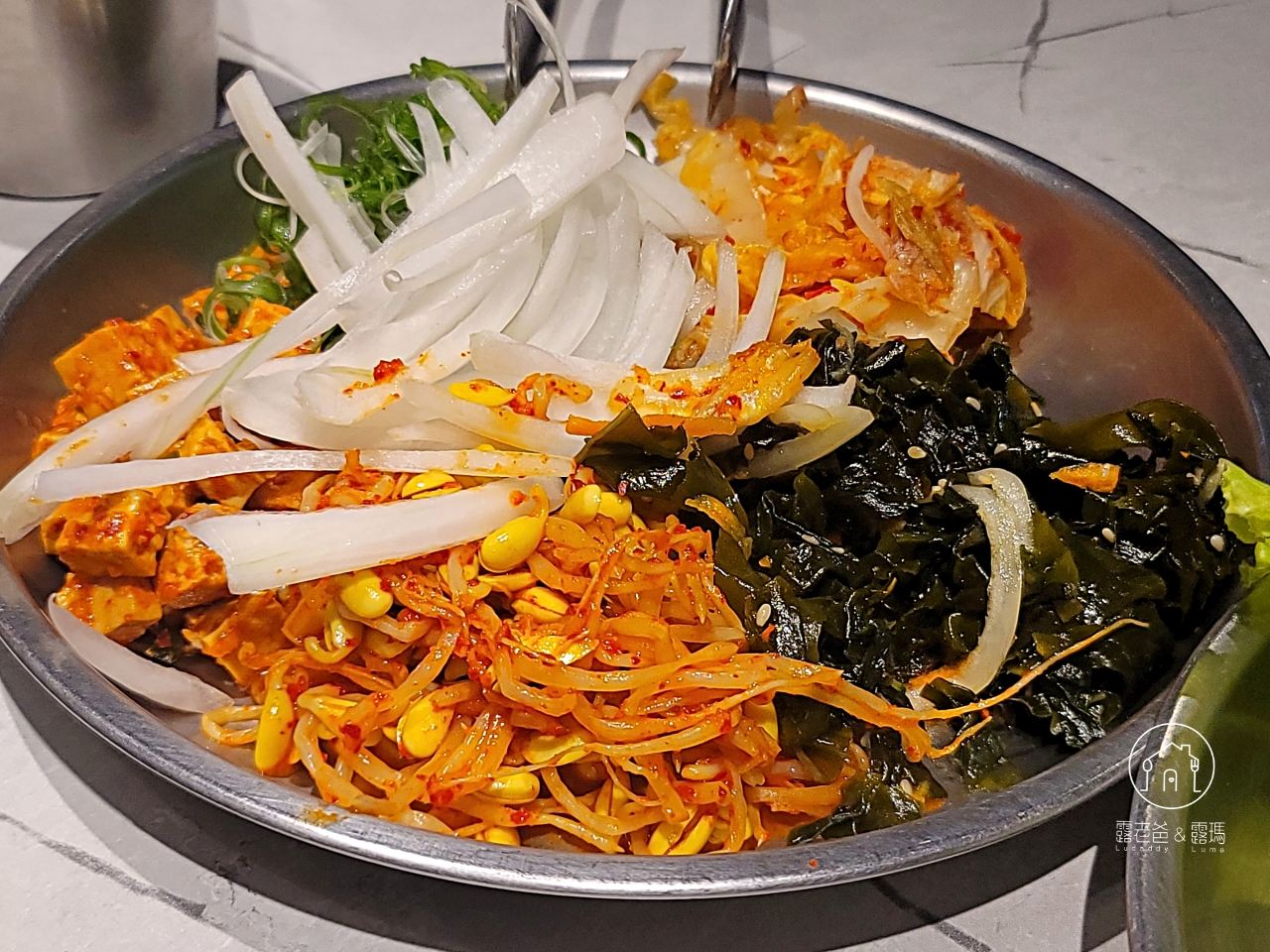 韓式小菜:泡菜、黃金泡菜、辣豆芽、醃蘿蔔、蔥絲,搭配烤肉超級對味。