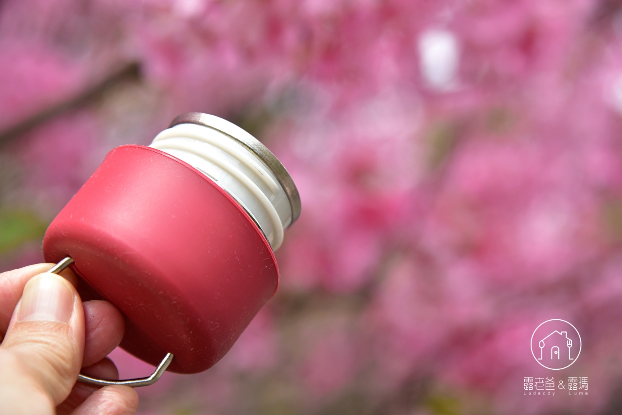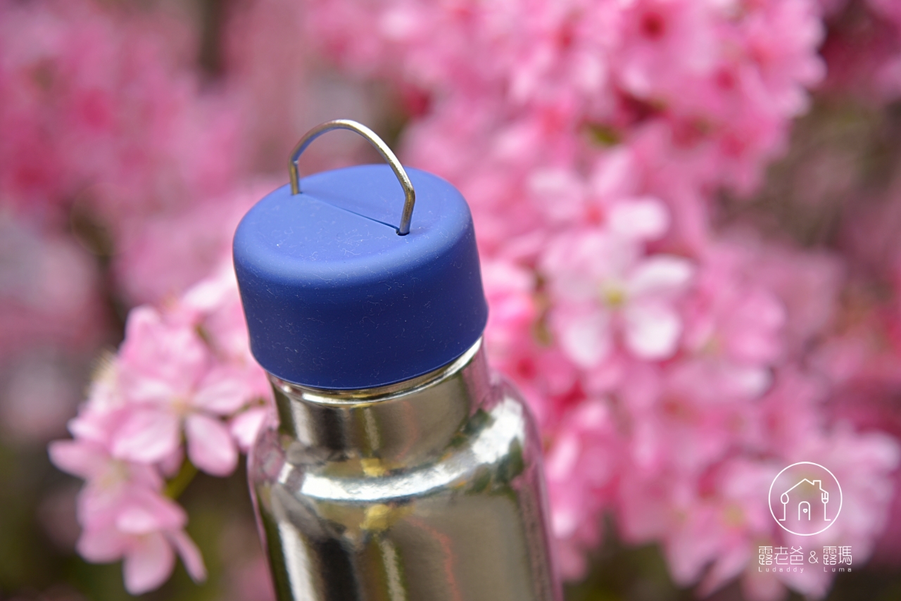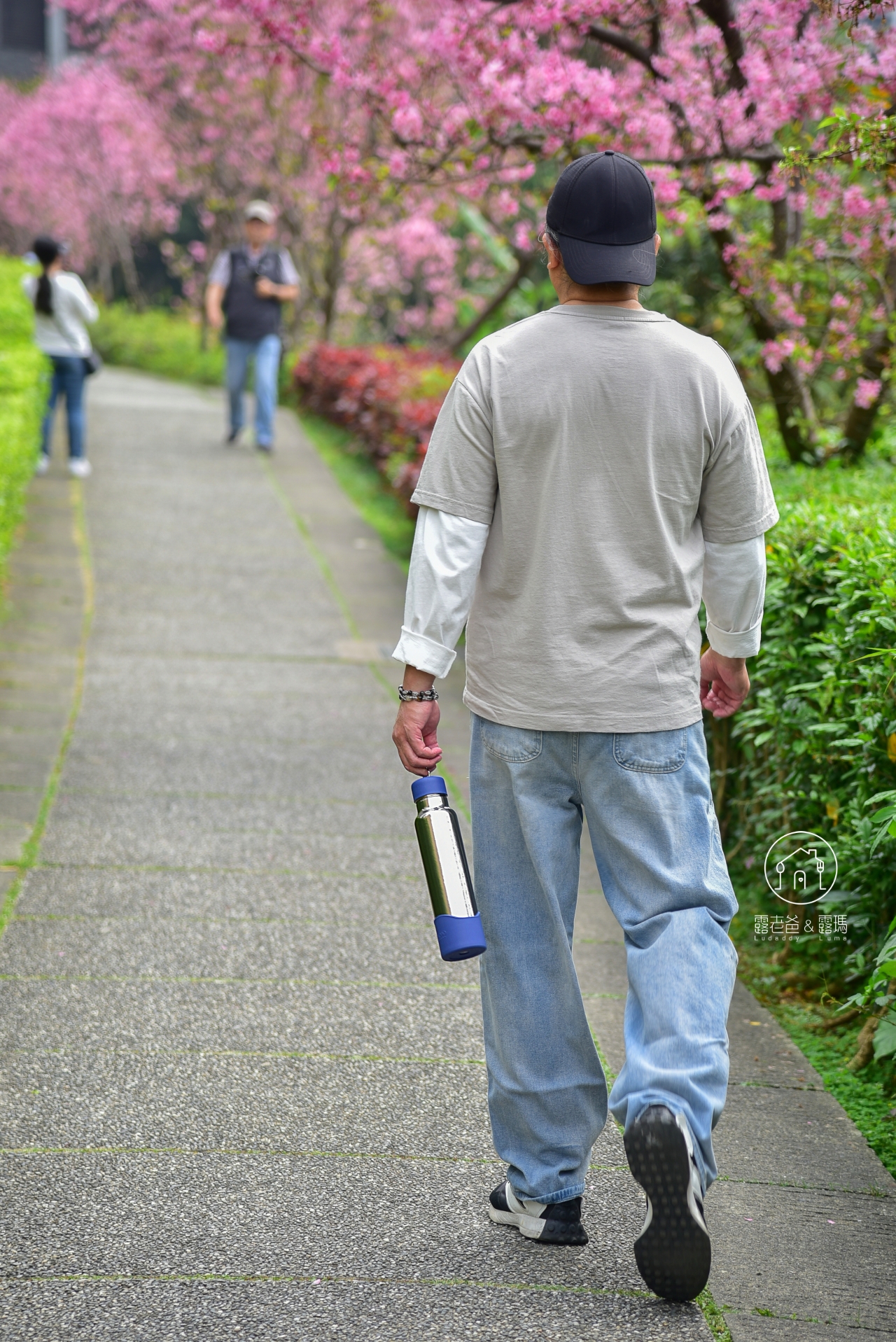 純鈦袋鼠保溫瓶的輕盈度確實令人驚艷,特別是大容量款式,即便裝滿水也不顯沉重。有提環的加持,露老爸一隻手指頭就能拎著逛櫻花。