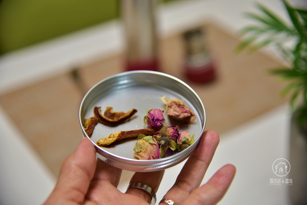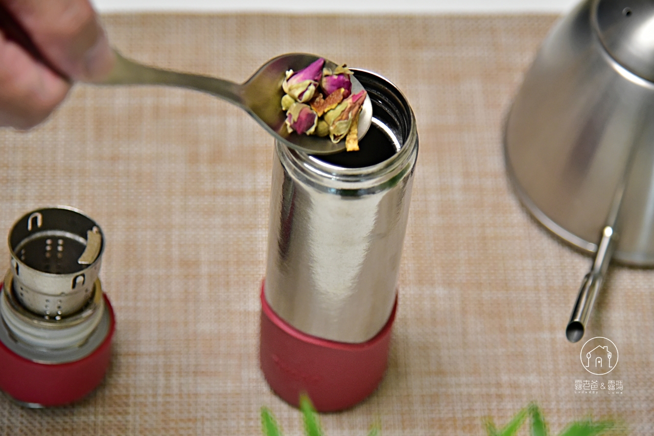 用鈦湯匙將玫瑰+橘皮放入保溫壺中,用【TiANN】手沖咖啡壺將熱水加入TiKOBO 袋鼠保溫瓶中,放入茶隔,就能茶湯分離,滿滿的天然花果香氣,自己泡無須擔心食安問題,既健康又養生。
