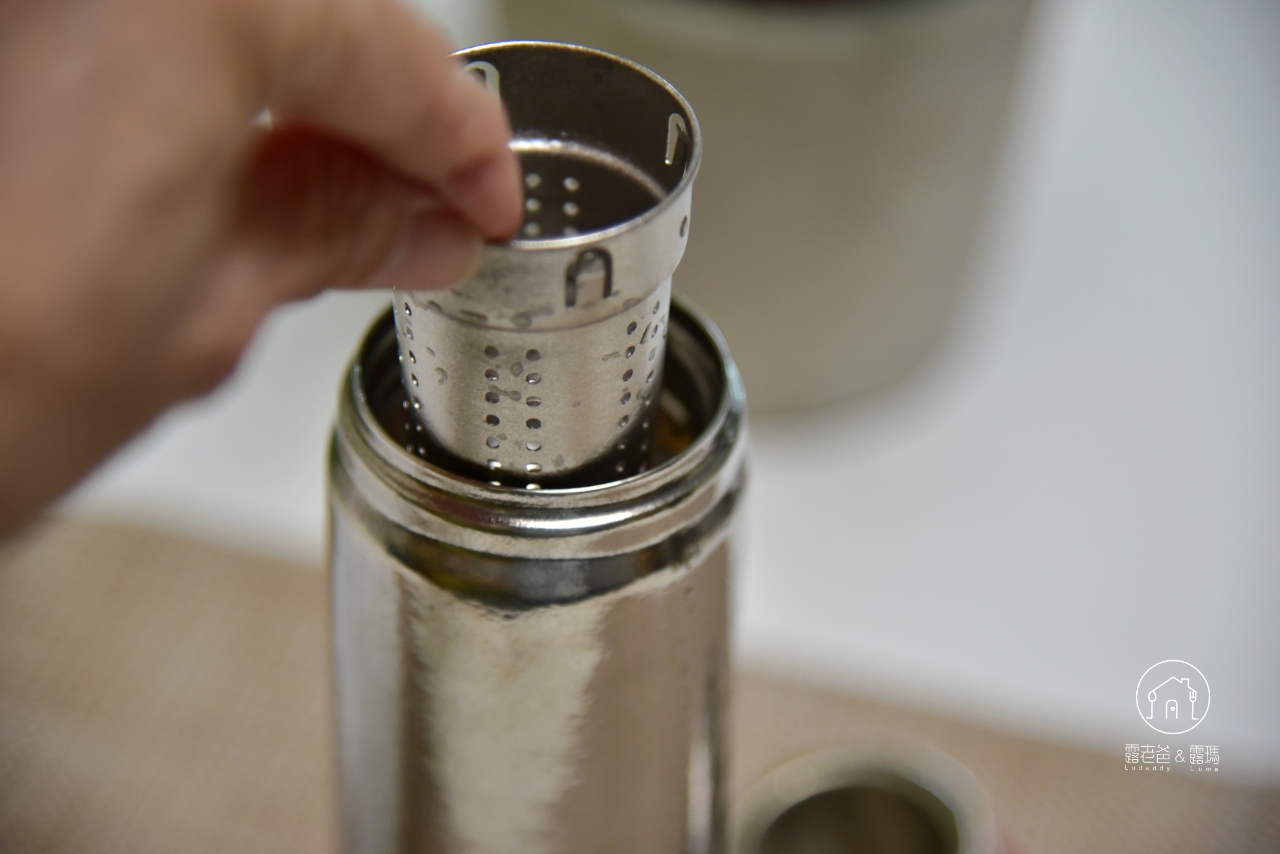 愛喝茶的露老爸真的很愛的茶隔設計,放入可拆式茶隔,不論是茶葉、花 草茶、養生茶、茶包…,都能與茶水隔離,保溫杯也能泡出溫潤清澈的茶水!