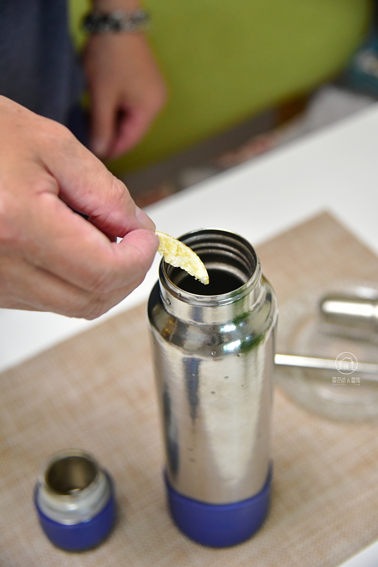 保溫杯寬瓶口很方便,加冰塊+乾柳橙片+梅子汽水,放入茶隔,插入吸管,清爽解膩的柳橙梅子汽水就可以開喝了。